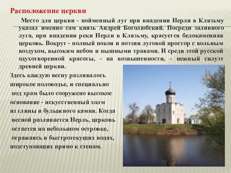 впадении Нерли в Клязьму указал именно сам князь Андрей Боголюбский. Посреди заливного луга, при впадении реки Нерли в Клязьму, красуется белокаменная церковь. Вокруг - полный покоя и поэзии луговой простор с вольным воздухом, высоким небом и пышными травами. И среди этой русской одухотворенной красоты, - на возвышенности, - нежный силуэт древней церкви.