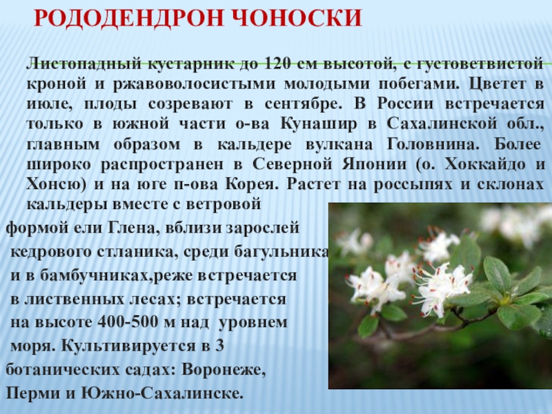 кроной и ржавоволосистыми молодыми побегами. Цветет в июле, плоды созревают в сентябре. В России встречается только в южной части о-ва Кунашир в Сахалинской обл., главным образом в кальдере вулкана Головнина. Более широко распространен в Северной Японии (о. Хоккайдо и Хонсю) и на юге п-ова Корея. Растет на россыпях и склонах кальдеры вместе с ветровой