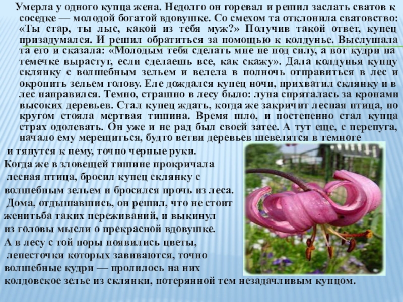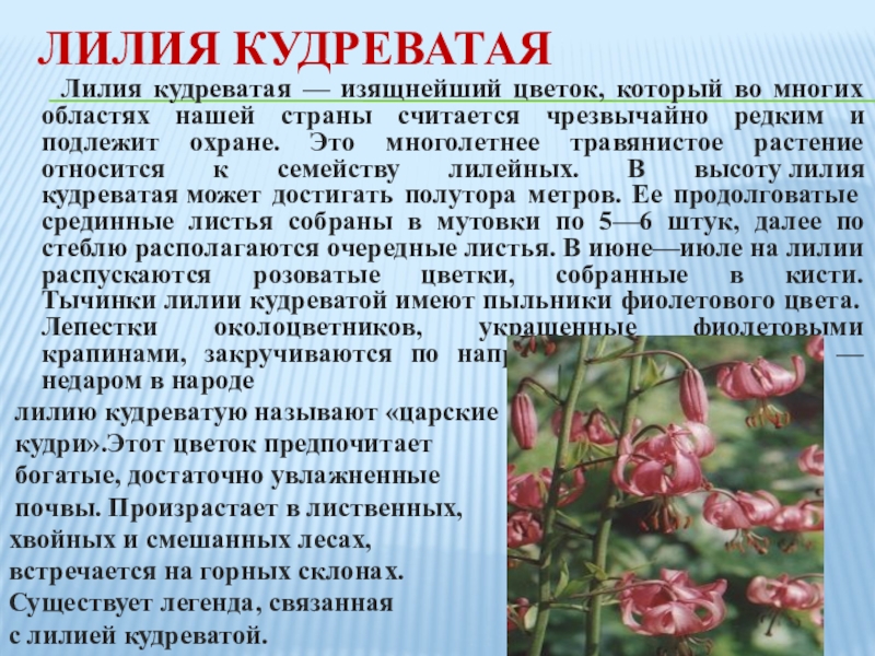 многих областях нашей страны считается чрезвычайно редким и подлежит охране. Это многолетнее травянистое растение относится к семейству лилейных. В высоту лилия кудреватая может достигать полутора метров. Ее продолговатые срединные листья собраны в мутовки по 5—6 штук, далее по стеблю располагаются очередные листья. В июне—июле на лилии распускаются розоватые цветки, собранные в кисти. Тычинки лилии кудреватой имеют пыльники фиолетового цвета. Лепестки околоцветников, украшенные фиолетовыми крапинами, закручиваются по направлению к цветоножке — недаром в народе