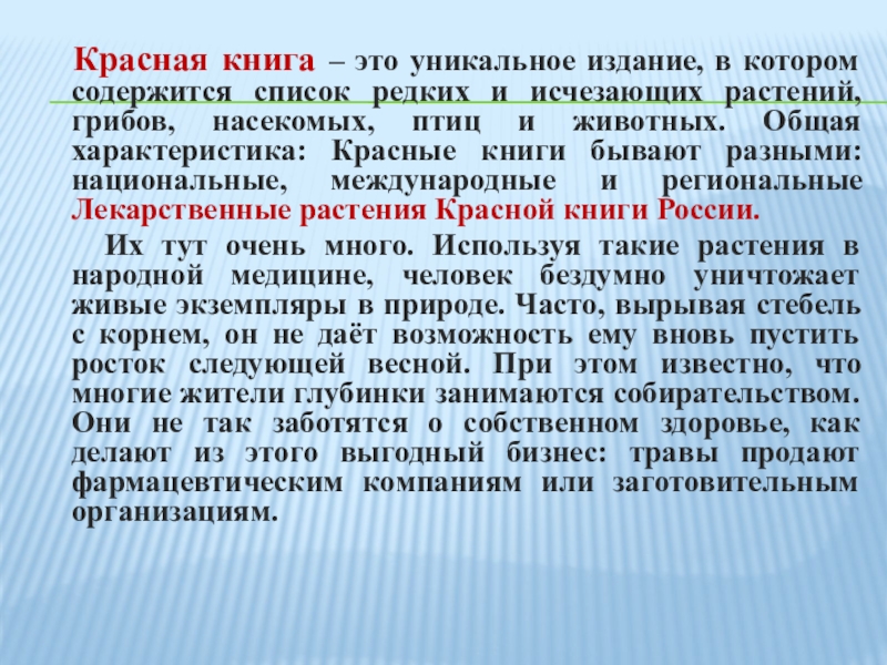 список редких и исчезающих растений, грибов, насекомых, птиц и животных. Общая характеристика: Красные книги бывают разными: национальные, международные и региональные Лекарственные растения Красной книги России.