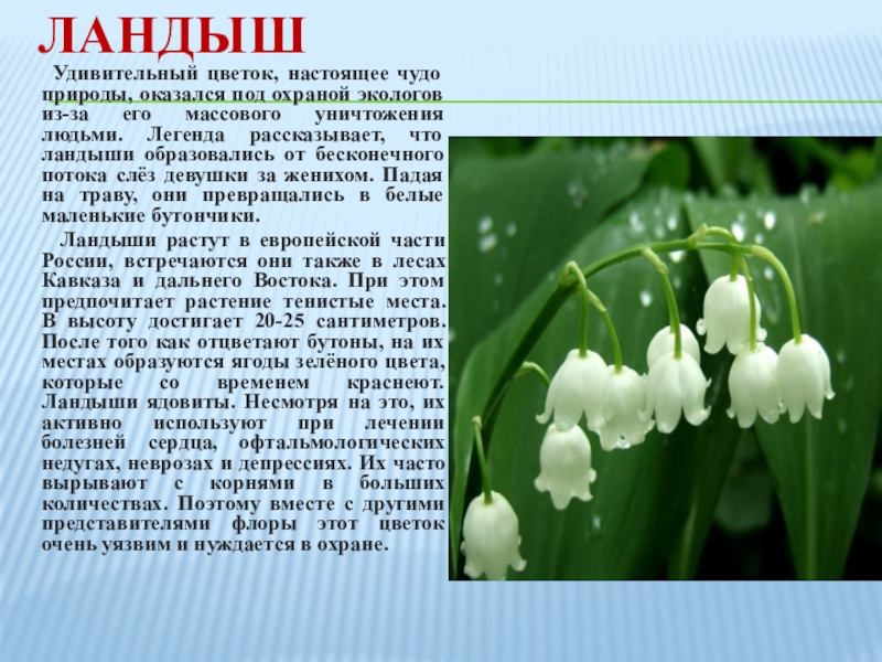 охраной экологов из-за его массового уничтожения людьми. Легенда рассказывает, что ландыши образовались от бесконечного потока слёз девушки за женихом. Падая на траву, они превращались в белые маленькие бутончики.