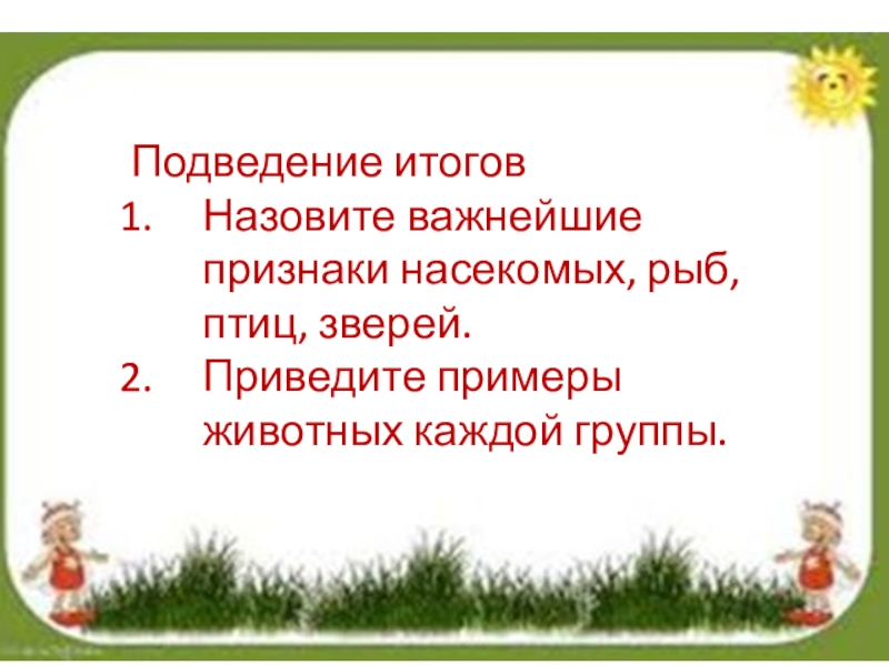 Подведение итоговНазовите важнейшие признаки насекомых, рыб, птиц, зверей.Приведите примеры животных каждой группы.