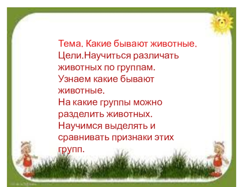 Тема. Какие бывают животные.Цели.Научиться различать животных по группам.Узнаем какие бывают животные.На какие группы можно разделить животных.Научимся выделять