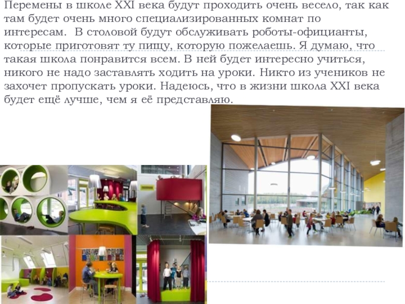 там будет очень много специализированных комнат по интересам.  В столовой будут обслуживать роботы-официанты, которые приготовят ту пищу, которую пожелаешь. Я думаю, что такая школа понравится всем. В ней будет интересно учиться, никого не надо заставлять ходить на уроки. Никто из учеников не захочет пропускать уроки. Надеюсь, что в жизни школа XXI века будет ещё лучше, чем я её представляю.