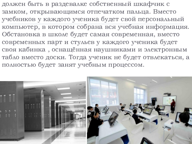 быть в раздевалке собственный шкафчик с замком, открывающимся отпечатком пальца. Вместо учебников у каждого ученика будет свой персональный компьютер, в котором собрана вся учебная информация. Обстановка в школе будет самая современная, вместо современных парт и стульев у каждого ученика будет своя кабинка , оснащённая наушниками и электронным табло вместо доски. Тогда ученик не будет отвлекаться, а полностью будет занят учебным процессом.