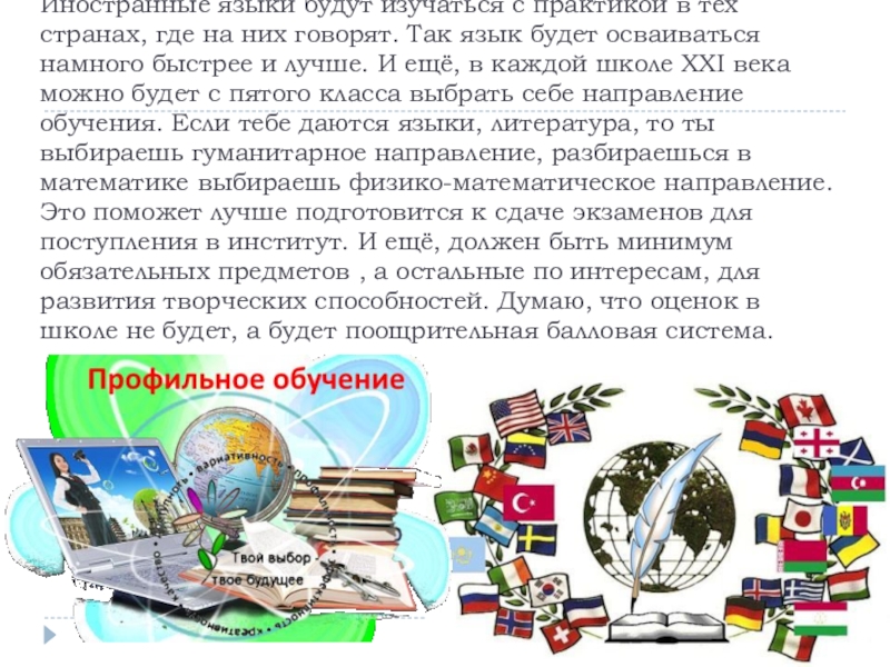 них говорят. Так язык будет осваиваться намного быстрее и лучше. И ещё, в каждой школе XXI века можно будет с пятого класса выбрать себе направление обучения. Если тебе даются языки, литература, то ты выбираешь гуманитарное направление, разбираешься в математике выбираешь физико-математическое направление. Это поможет лучше подготовится к сдаче экзаменов для поступления в институт. И ещё, должен быть минимум обязательных предметов , а остальные по интересам, для развития творческих способностей. Думаю, что оценок в школе не будет, а будет поощрительная балловая система.