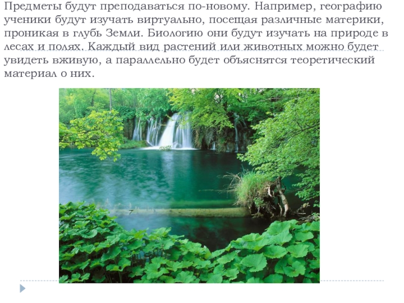 Слайд 4Предметы будут преподаваться по-новому. Например, географию ученики будут изучать виртуально, посещая