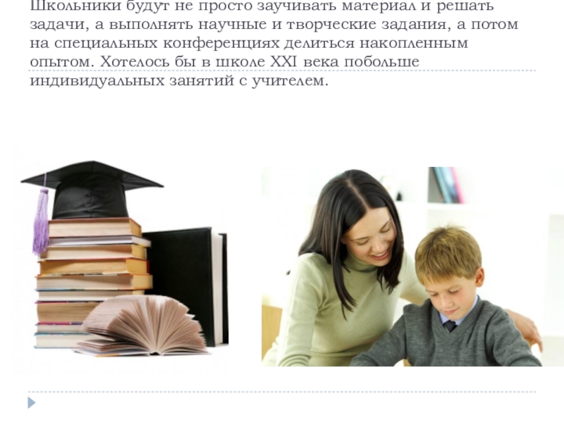 научные и творческие задания, а потом на специальных конференциях делиться накопленным опытом. Хотелось бы в школе XXI века побольше индивидуальных занятий с учителем.