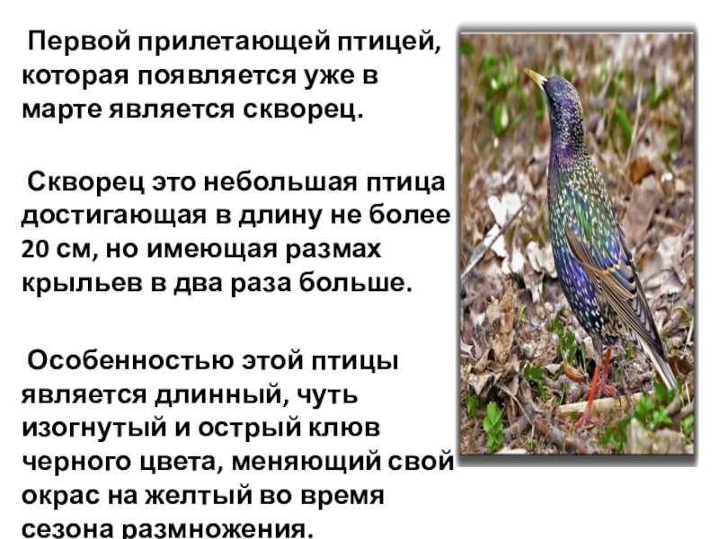 Первой прилетающей птицей, которая появляется уже в марте является скворец. Скворец это небольшая птица достигающая в длину не более 20 см, но имеющая размах крыльев в два раза больше. Особенностью этой птицы является