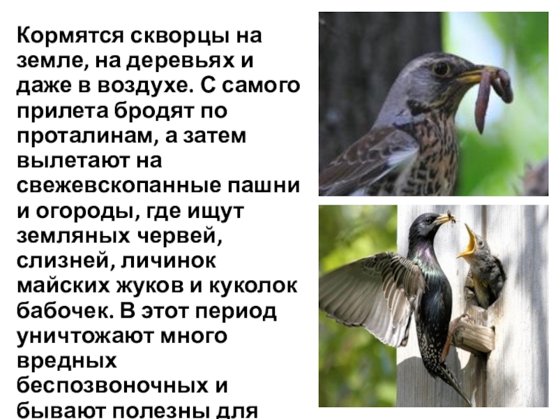 Слайд 4Кормятся скворцы на земле, на деревьях и даже в воздухе. С