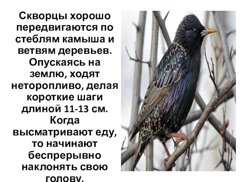 Слайд 5Скворцы хорошо передвигаются по стеблям камыша и ветвям деревьев. Опускаясь на
