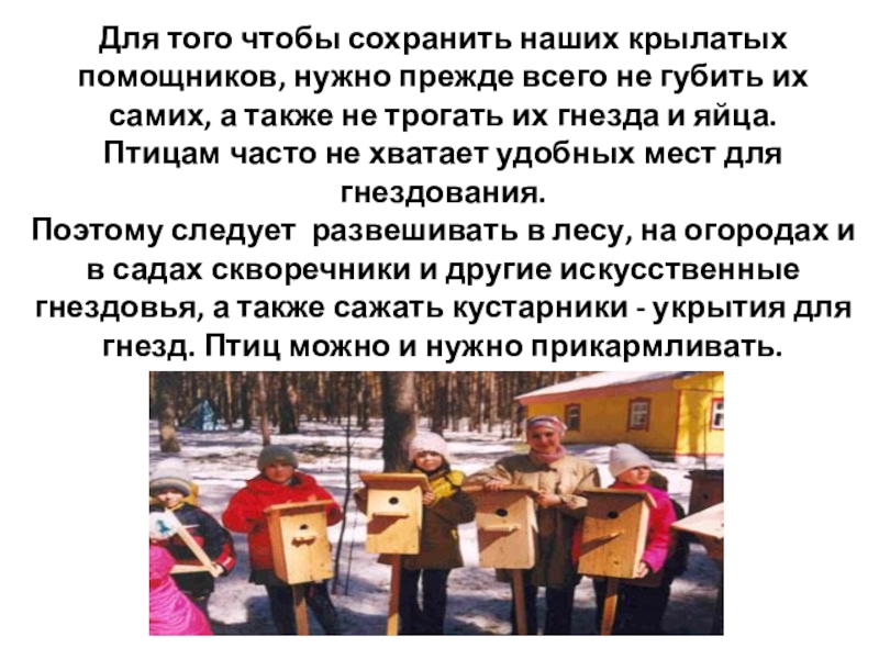 Слайд 6 Для того чтобы сохранить наших крылатых помощников, нужно прежде всего не
