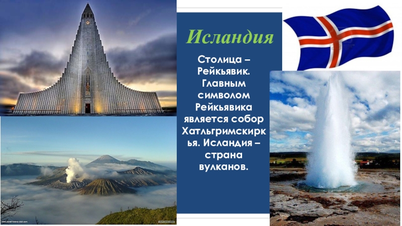 ИсландияСтолица – Рейкьявик. Главным символом Рейкьявика является собор Хатльгримскиркья. Исландия – страна вулканов.