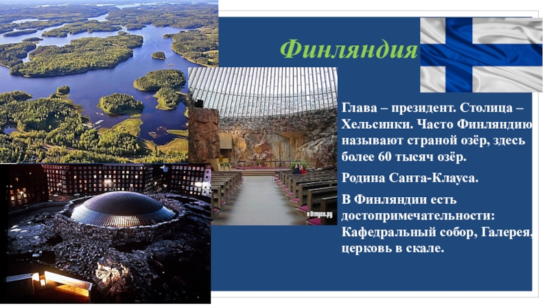ФинляндияГлава – президент. Столица – Хельсинки. Часто Финляндию называют страной озёр, здесь более 60 тысяч озёр.Родина Санта-Клауса.В