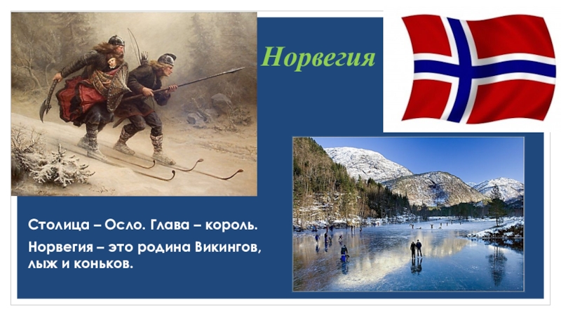 НорвегияСтолица – Осло. Глава – король.Норвегия – это родина Викингов, лыж и коньков.