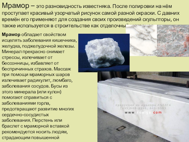 Мрамор обладает свойством исцелять заболевания кишечника, желудка, поджелудочной железы. Минерал прекрасно снимает стрессы, излечивает от бессонницы, избавляет от беспричинных страхов. Массаж при помощи мраморных шаров излечивает радикулит, люмбаго, заболевания сосудов. Бусы из этого минерала (или кулон) помогают справиться с заболеваниями горла, предотвращают развитие многих сердечно-сосудистых заболевания. Перстень или браслет с мраморной вставкой рекомендуется носить людям, страдающим повышенной потливостью.