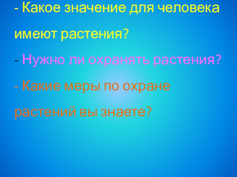 - Какое значение для человека имеют растения? - Нужно ли охранять растения? - Какие меры по охране