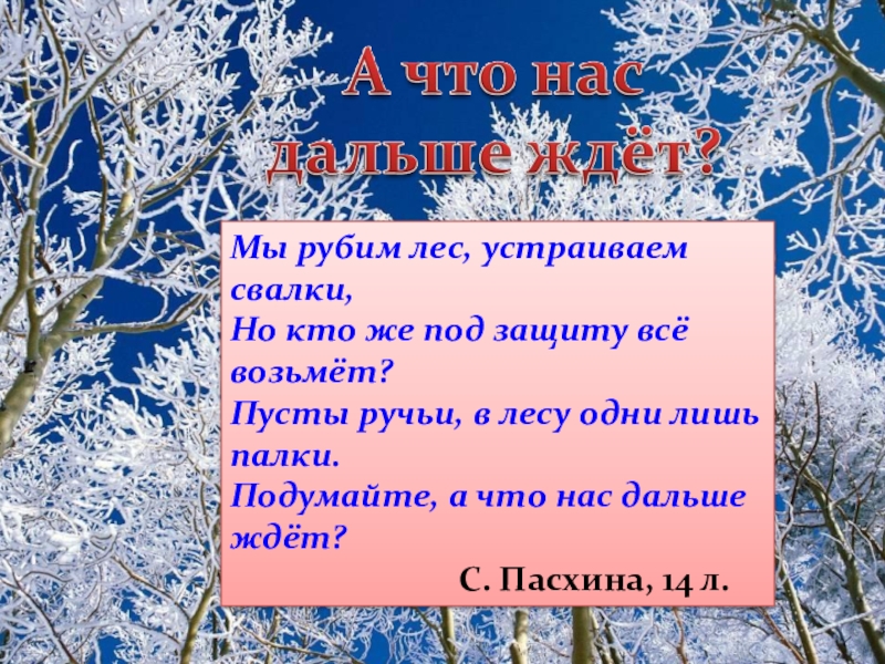 Мы рубим лес, устраиваем свалки,Но кто же под защиту всё возьмёт?Пусты ручьи, в лесу одни лишь палки.Подумайте,