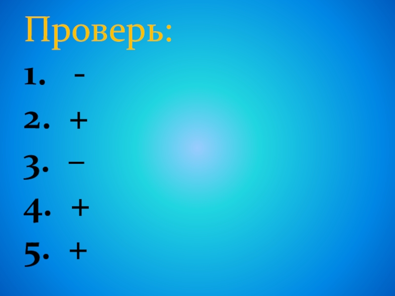 Слайд 21Проверь: 1. - 2. + 3. – 4. + 5. +