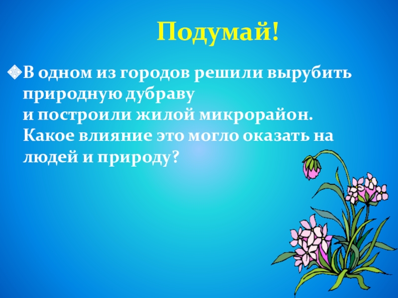 Подумай!В одном из городов решили вырубить природную дубраву и построили жилой микрорайон. Какое влияние это могло оказать