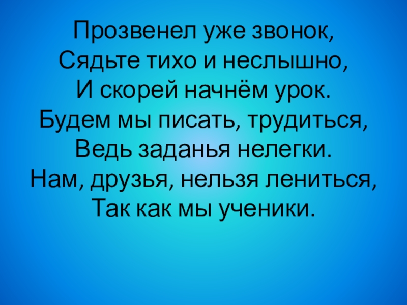 Прозвенел уже звонок, Сядьте тихо и неслышно, И скорей начнём урок. Будем мы писать, трудиться, Ведь заданья нелегки. Нам, друзья, нельзя лениться, Так как мы ученики.