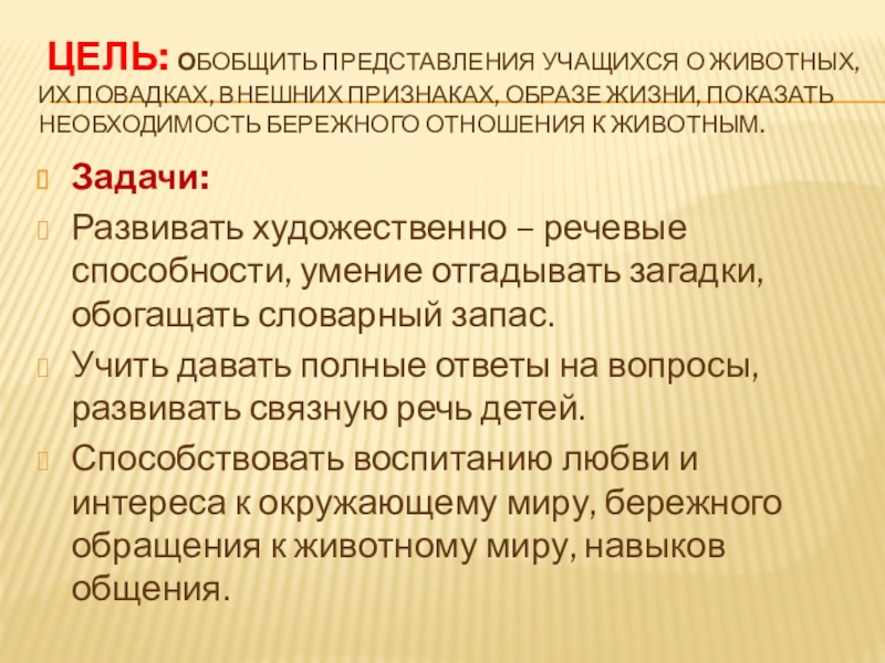 Слайд 2 Цель: Обобщить представления учащихся о животных, их повадках, внешних признаках,