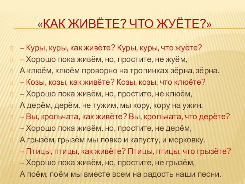 – Вы, крольчата, как живёте? Вы, крольчата, что дерёте?