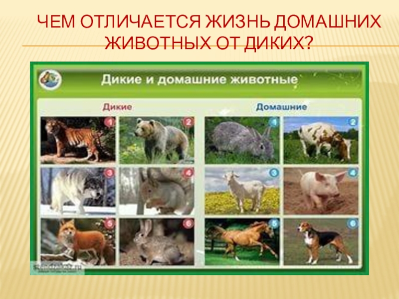 Слайд 7Чем отличается жизнь домашних животных от диких?