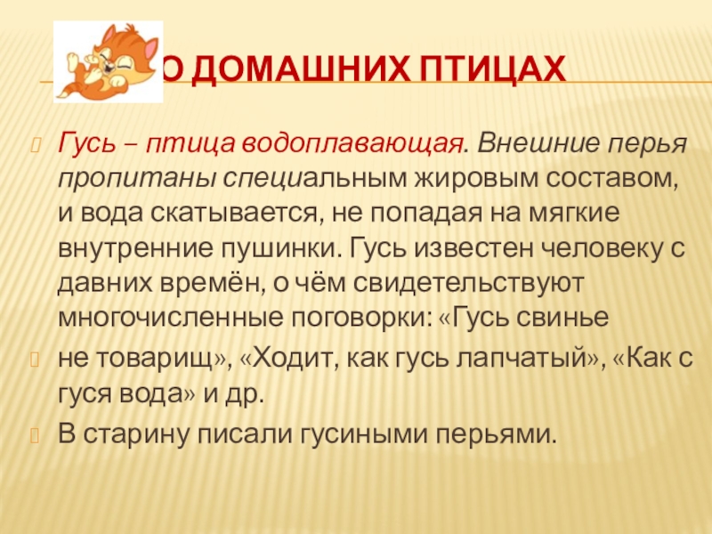 составом, и вода скатывается, не попадая на мягкие внутренние пушинки. Гусь известен человеку с давних времён, о чём свидетельствуют многочисленные поговорки: «Гусь свинье