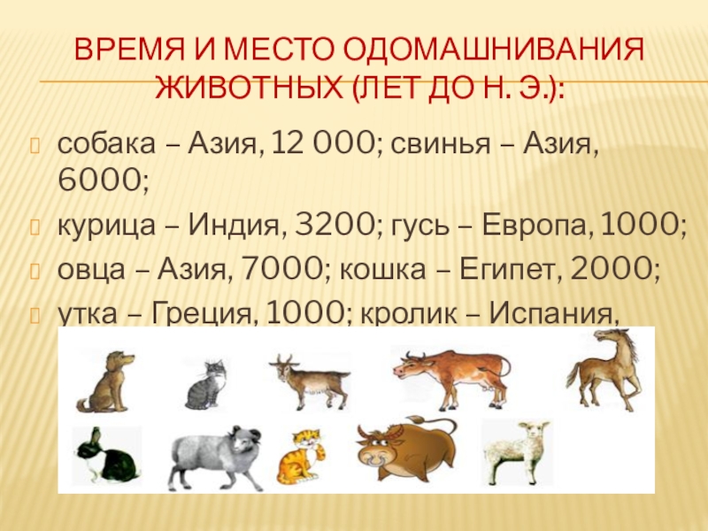 Слайд 31Время и место одомашнивания животных (лет до н. э.):