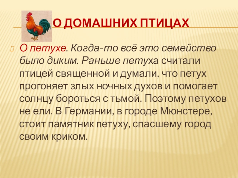петуха считали птицей священной и думали, что петух прогоняет злых ночных духов и помогает солнцу бороться с тьмой. Поэтому петухов не ели. В Германии, в городе Мюнстере, стоит памятник петуху, спасшему город своим криком.