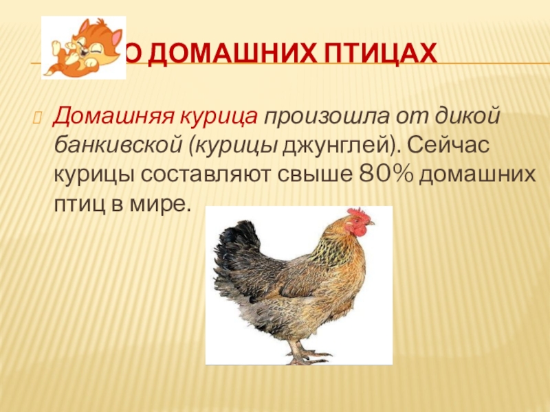 Домашняя курица произошла от дикой банкивской (курицы джунглей). Сейчас