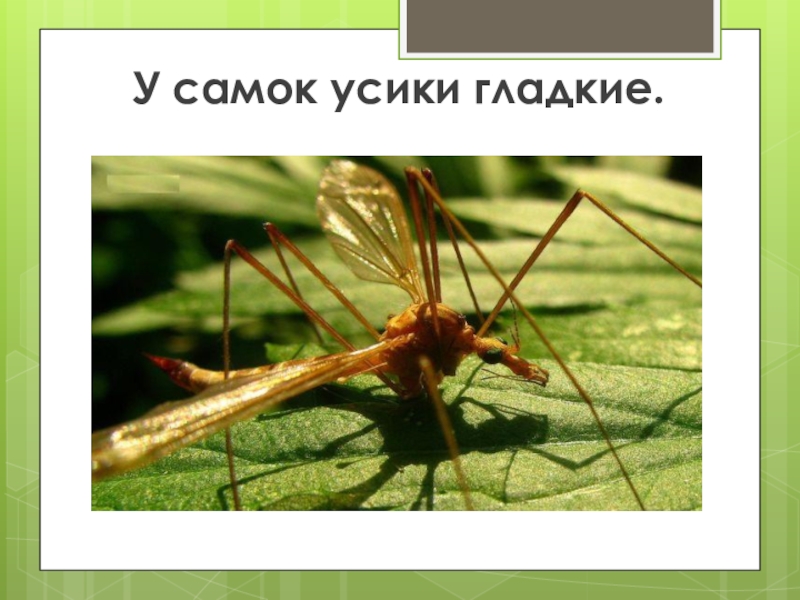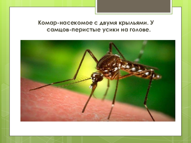 Слайд 2Комар-насекомое с двумя крыльями. У самцов-перистые усики на голове.