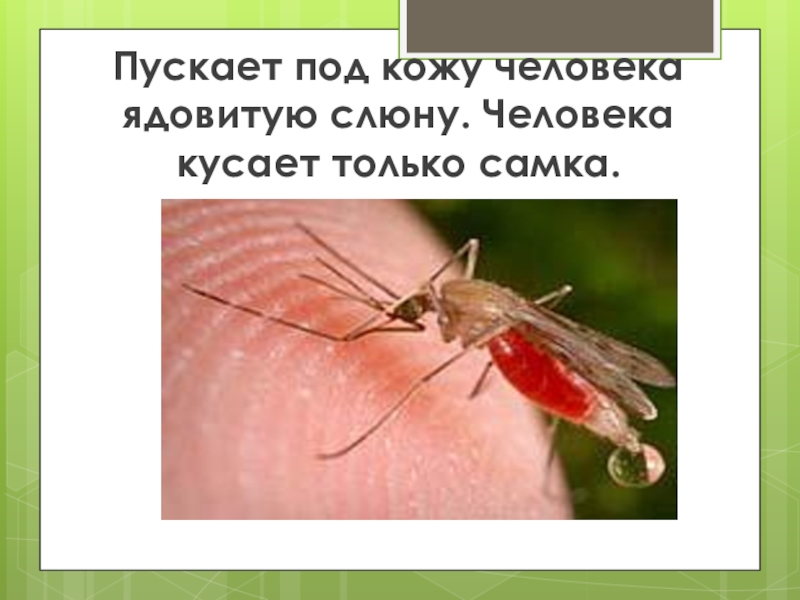 Слайд 6Пускает под кожу человека ядовитую слюну. Человека кусает только самка.