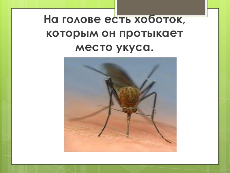 Слайд 5На голове есть хоботок, которым он протыкает место укуса.