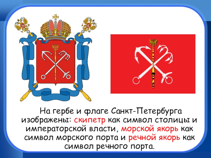 На гербе и флаге Санкт-Петербурга изображены: скипетр как символ столицы и императорской власти, морской якорь как символ