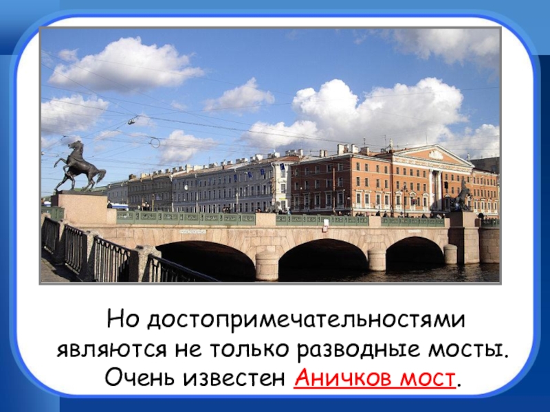 Но достопримечательностями являются не только разводные мосты. Очень известен Аничков мост.