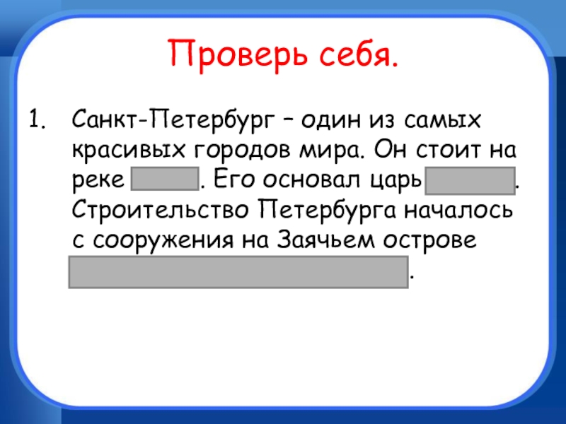Проверь себя.Санкт-Петербург – один из самых красивых городов мира. Он стоит на реке Неве . Его основал