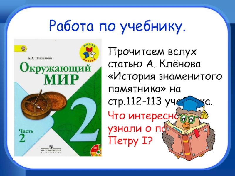 Работа по учебнику.Прочитаем вслух статью А. Клёнова «История знаменитого памятника» на стр.112-113 учебника.Что интересного вы узнали о