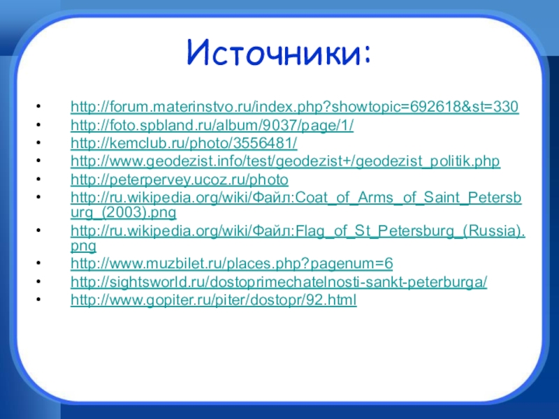 Источники:http://forum.materinstvo.ru/index.php?showtopic=692618&st=330http://foto.spbland.ru/album/9037/page/1/http://kemclub.ru/photo/3556481/http://www.geodezist.info/test/geodezist+/geodezist_politik.phphttp://peterpervey.ucoz.ru/photohttp://ru.wikipedia.org/wiki/Файл:Coat_of_Arms_of_Saint_Petersburg_(2003).pnghttp://ru.wikipedia.org/wiki/Файл:Flag_of_St_Petersburg_(Russia).pnghttp://www.muzbilet.ru/places.php?pagenum=6http://sightsworld.ru/dostoprimechatelnosti-sankt-peterburga/http://www.gopiter.ru/piter/dostopr/92.html