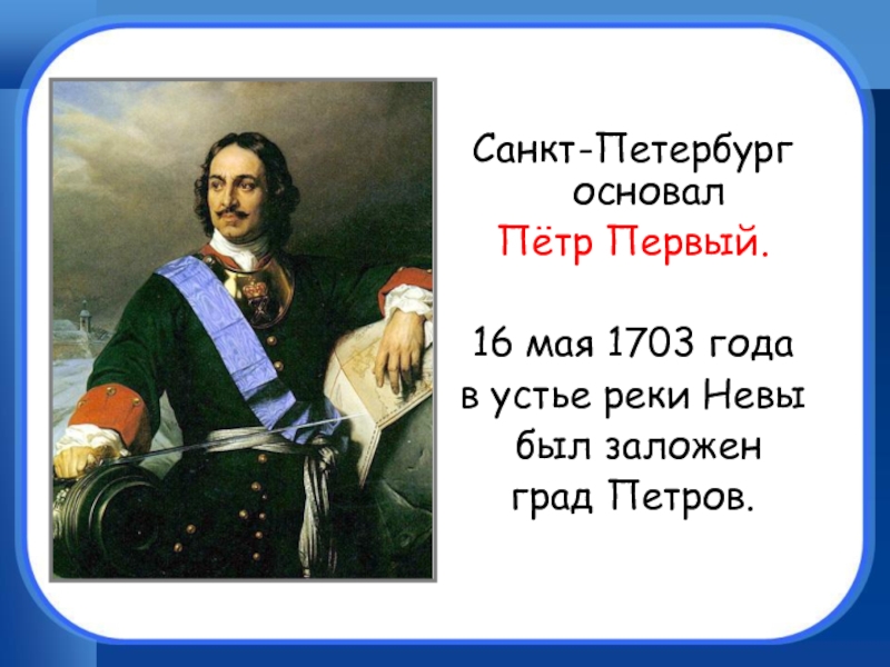 Санкт-Петербург основал Пётр Первый. 16 мая 1703 года в устье реки Невы был заложен град Петров.