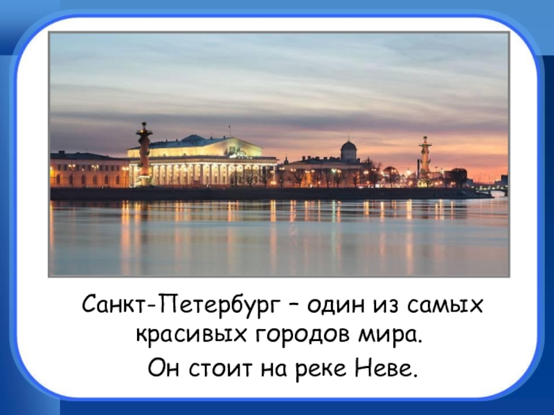 Санкт-Петербург – один из самых красивых городов мира. 	Он стоит на реке Неве.
