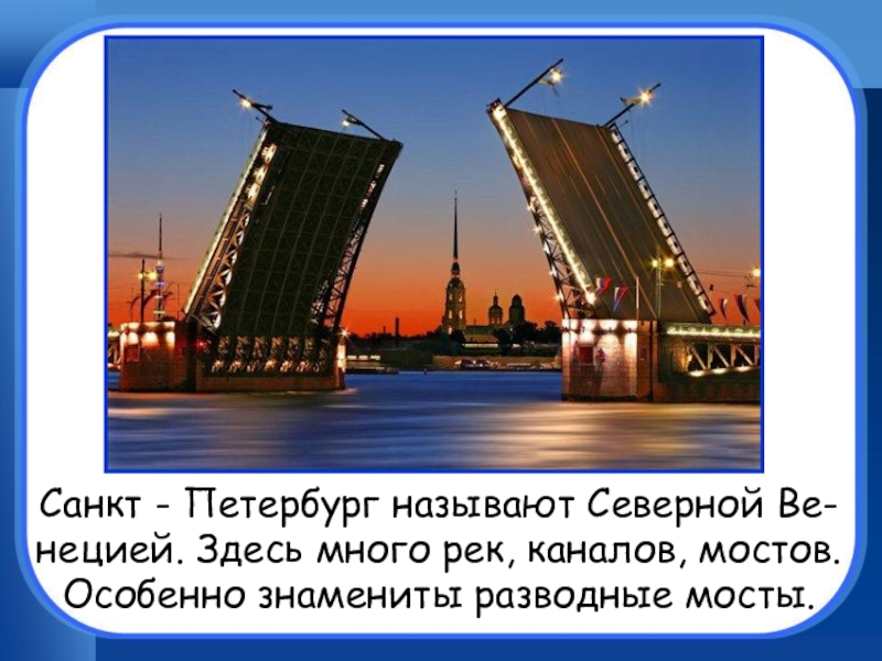 Санкт - Петербург называют Северной Ве-нецией. Здесь много рек, каналов, мостов.Особенно знамениты разводные мосты.