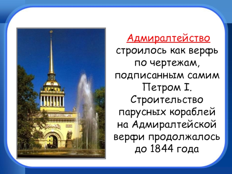 Адмиралтейство строилось как верфь по чертежам, подписанным самим Петром I. Строительство парусных кораблей на Адмиралтейской верфи продолжалось