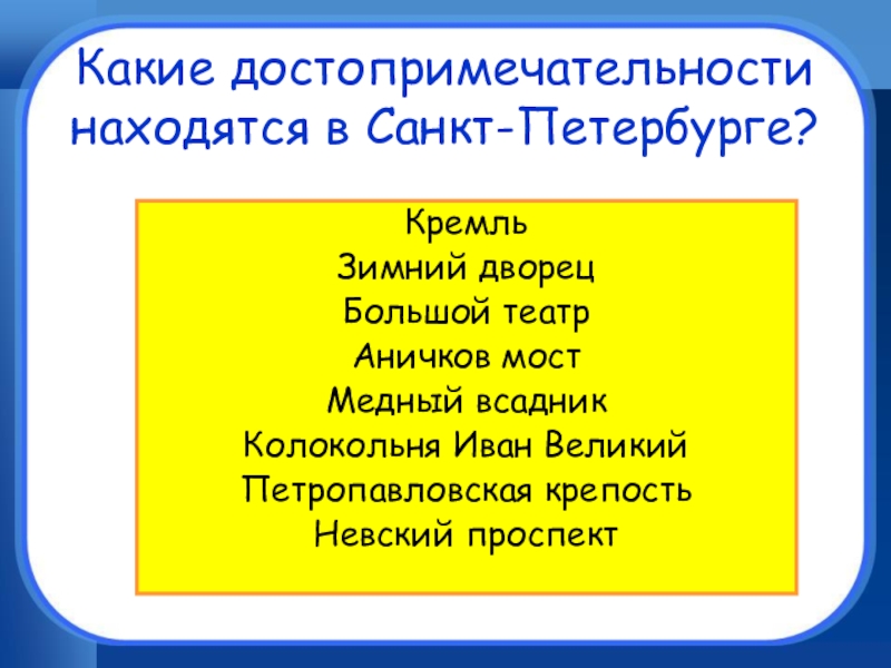 Слайд 47Какие достопримечательности находятся в Санкт-Петербурге?