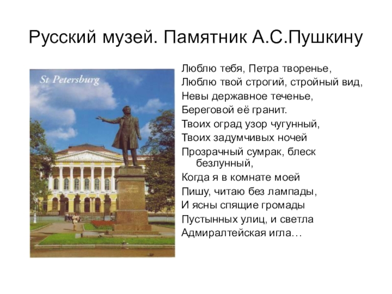 Русский музей. Памятник А.С.ПушкинуЛюблю тебя, Петра творенье,Люблю твой строгий, стройный вид,Невы державное теченье,Береговой её гранит.Твоих оград узор