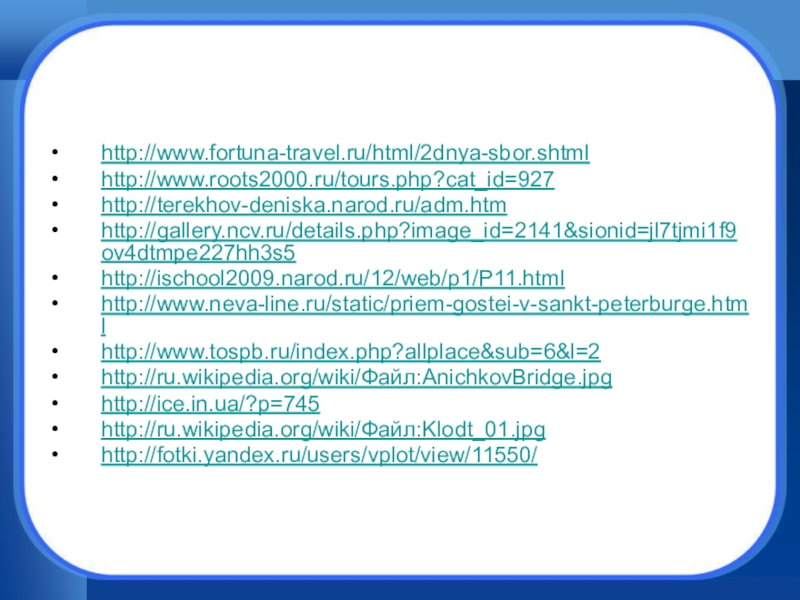 http://www.fortuna-travel.ru/html/2dnya-sbor.shtmlhttp://www.roots2000.ru/tours.php?cat_id=927http://terekhov-deniska.narod.ru/adm.htmhttp://gallery.ncv.ru/details.php?image_id=2141&sionid=jl7tjmi1f9ov4dtmpe227hh3s5http://ischool2009.narod.ru/12/web/p1/P11.htmlhttp://www.neva-line.ru/static/priem-gostei-v-sankt-peterburge.htmlhttp://www.tospb.ru/index.php?allplace&sub=6&l=2http://ru.wikipedia.org/wiki/Файл:AnichkovBridge.jpghttp://ice.in.ua/?p=745http://ru.wikipedia.org/wiki/Файл:Klodt_01.jpghttp://fotki.yandex.ru/users/vplot/view/11550/