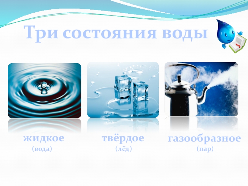 Три состояния водыжидкое(вода)твёрдое(лёд)газообразное(пар)