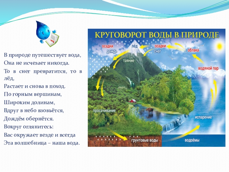 В природе путешествует вода,Она не исчезает никогда.То в снег превратится, то в лёд,Растает и снова в поход.По