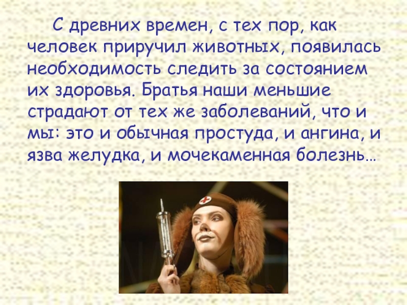 Слайд 4 У ветеринарии очень древняя история, а профессия врача, исцеляющего животных, скорее